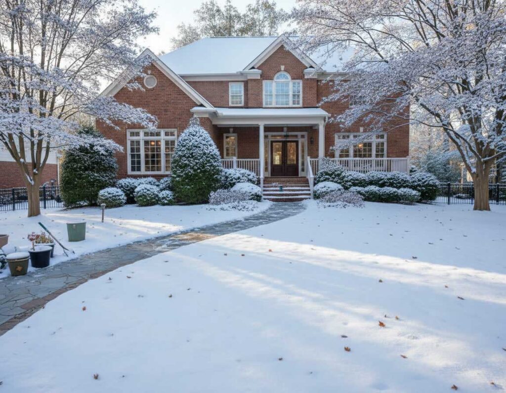 “We design with winter in mind,” our team explains. “A few evergreens, stone accents, and lighting can transform what would otherwise be a dull space into something peaceful and beautiful.”